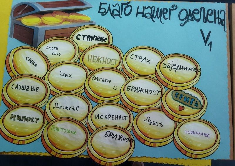 Представници Вршњачког тима су у својим одељењима реализовали активност под називом „Ковчег са благом“. Разговарало се о љубави и толеранцији, а затим се откривало благо које ће ученици неуморно чувати.